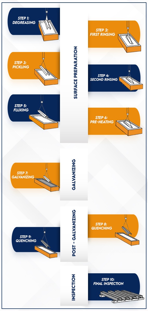 Hot dip galvanizing is a protective coating process in   which steel or iron is immersed in a bath of molten zinc  at around 450°C (840°F). This process creates a strong,  corrosion-resistant layer that bonds metallurgically to  the base metal, protecting it from rust, moisture,  and environmental damage.
